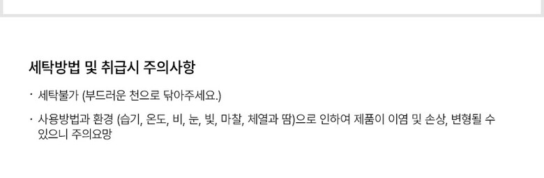 7. 취급시 주의사항 | 열이나 직사광선, 습기에 주의하고, 부드러운 소재를 사용하여 닦아주시기 바랍니다. |