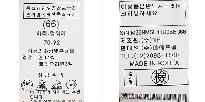 1. 제품 소재 (섬유의 조성 또는 혼용률을 백분율로 표시, 기능성인 경우 성적서 또는 허가서) 겉감-면97% 폴리우레탄3%