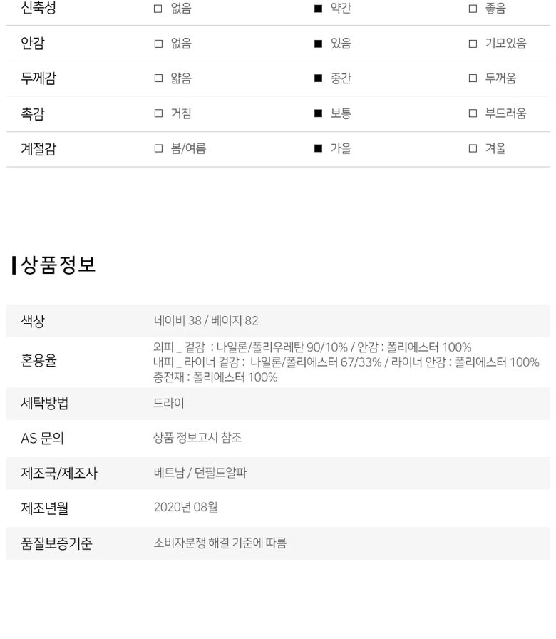 제품소재 : 외피겉감-나일론90%,폴리우레탄10%