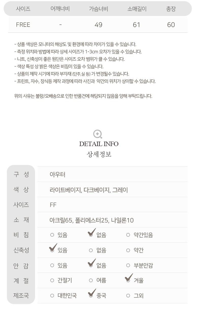 1. 제품 소재 (섬유의 조성 또는 혼용률을 백분율로 표시, 기능성인 경우 성적서 또는 허가서) | 상세페이지 참조 |
