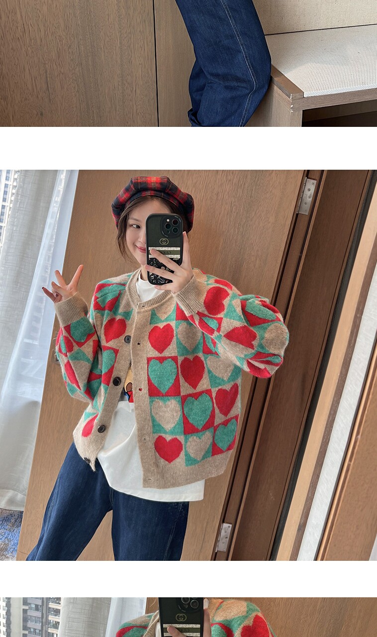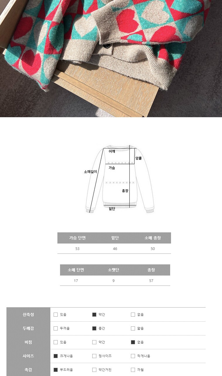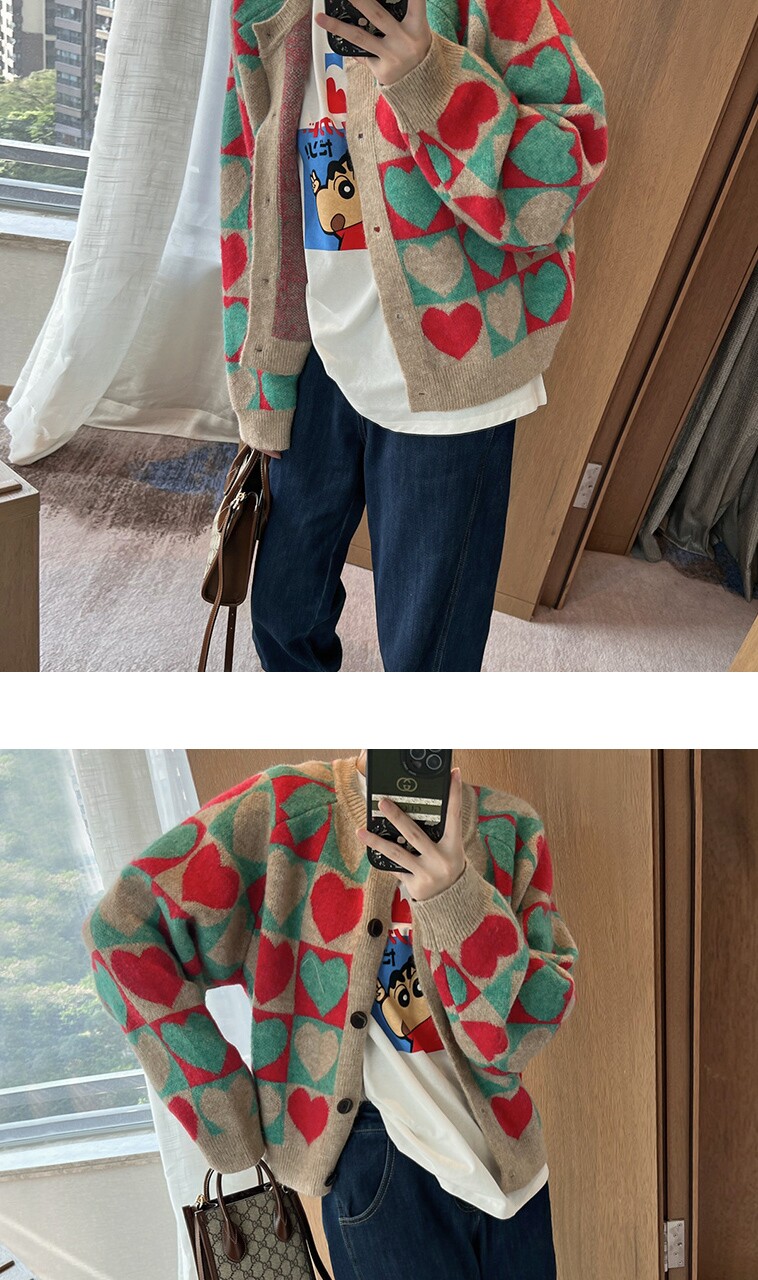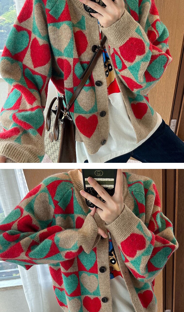 여성 하트 배색 멋스러운 가디건 라운드넥 니트 가디건 긴팔 스웨터
