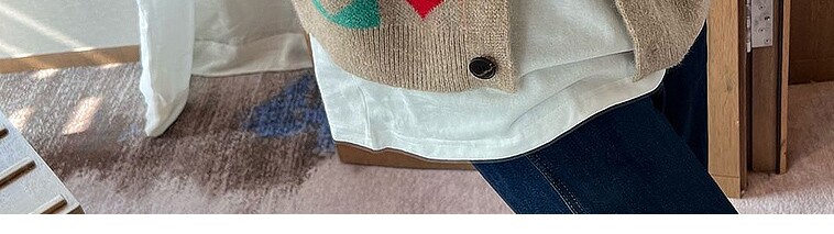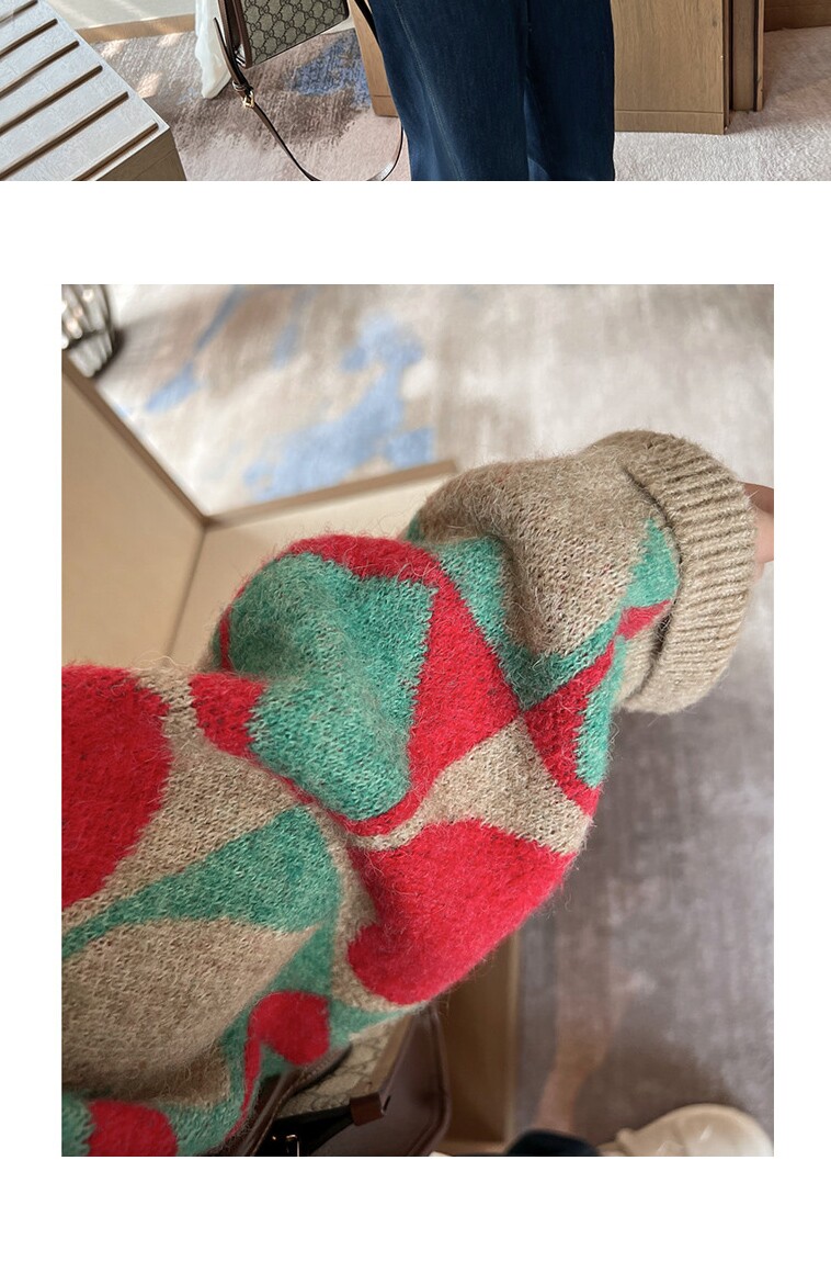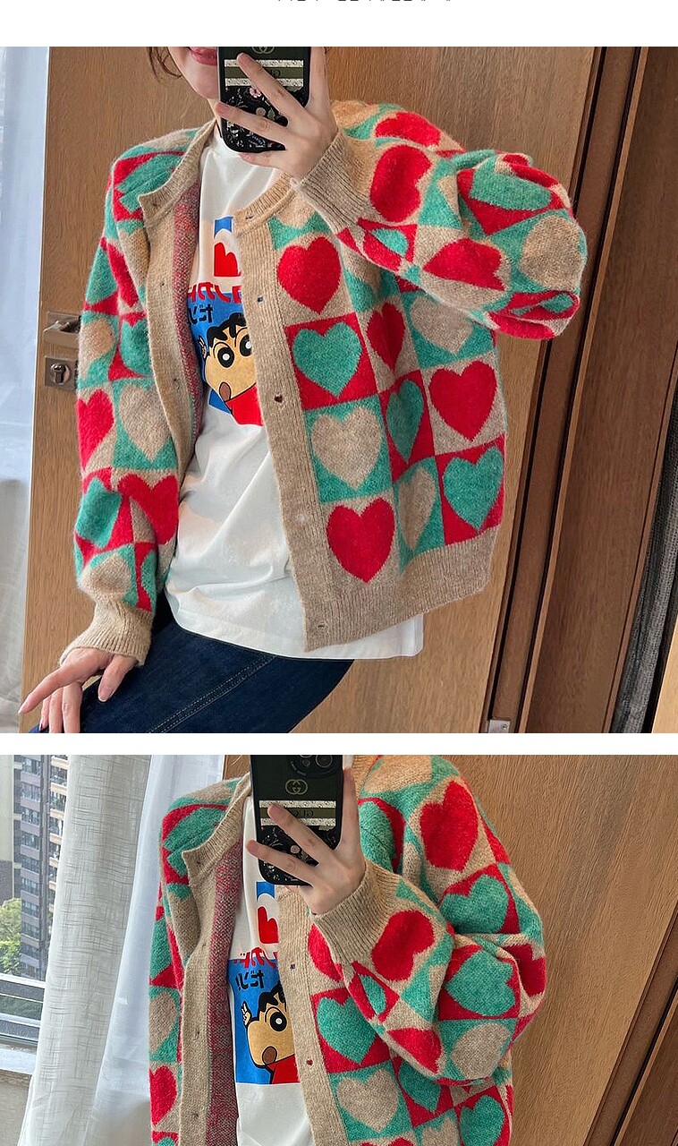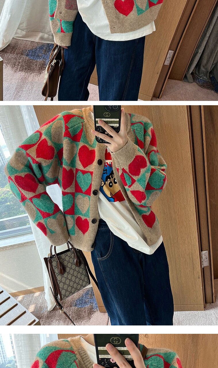 여성 하트 배색 멋스러운 가디건 라운드넥 니트 가디건 긴팔 스웨터