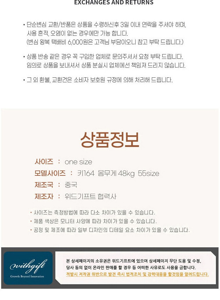 상품불량에 의한 반품, A/S, 품질보증 및 피해보상 등에 관한 사항은 소비자 분쟁해결기준(공정거래위원회 고시) 구매자가 미성년자인 경우에는 상품 구입시 법정대리인이 동의하지 아니하면 미성년자 본인 또는 법정대리인이 구매취소 할 수 있습니다. |