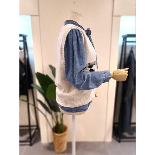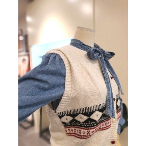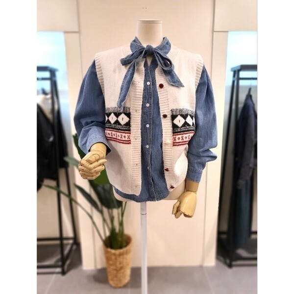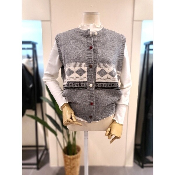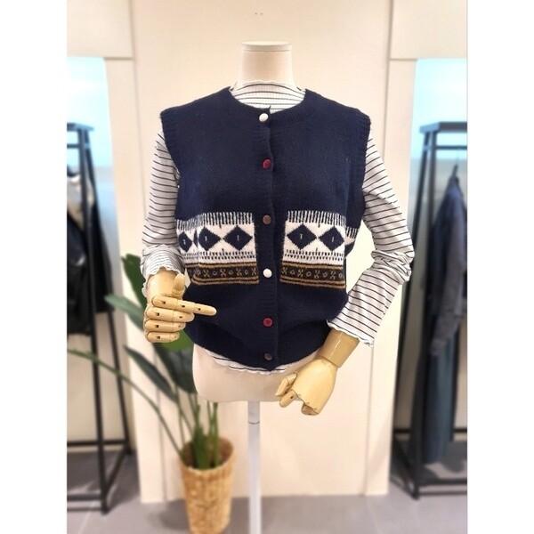 빈티지한 패턴과 컬러 단추가 매력적인 조끼입니다. 니트원단으로 따뜻합니다.