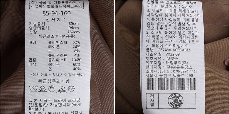 | 1. 제품 소재 (섬유의 조성 또는 혼용률을 백분율로 표시, 기능성인 경우 성적서 또는 허가서) | 겉감-폴리에스터62% 폴리우레탄4% 레이온26% 모8% 안감-폴리에스터100% 배색-레이온60%면40% |