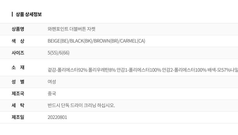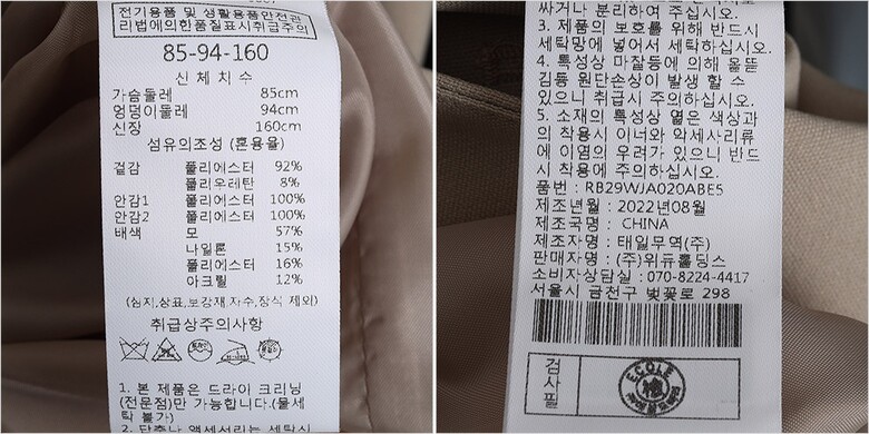 | 1. 제품 소재 (섬유의 조성 또는 혼용률을 백분율로 표시, 기능성인 경우 성적서 또는 허가서) | 겉감-폴리에스터92% 폴리우레탄8% 안감1-폴리에스터100% 안감2-폴리에스터100% 배색-모57%나일론15%폴리에스터16%아크릴12% |