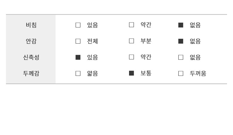 | 1. 제품 소재 (섬유의 조성 또는 혼용률을 백분율로 표시, 기능성인 경우 성적서 또는 허가서) | 상세페이지 참조 |