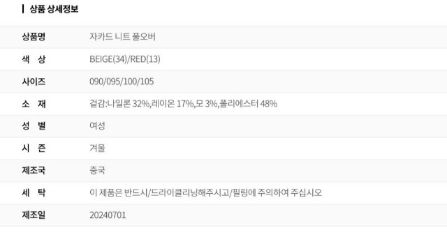 | 6. 세탁방법 및 취급시 주의사항 | 상품상세참조 |