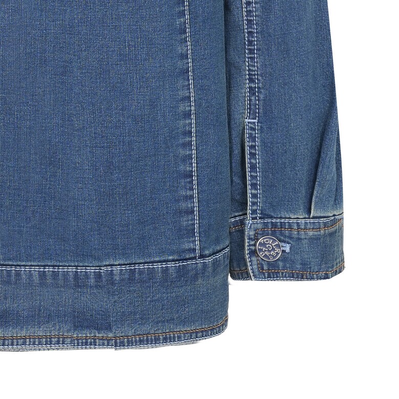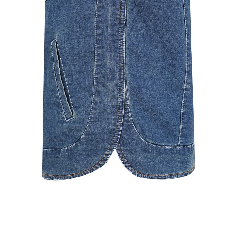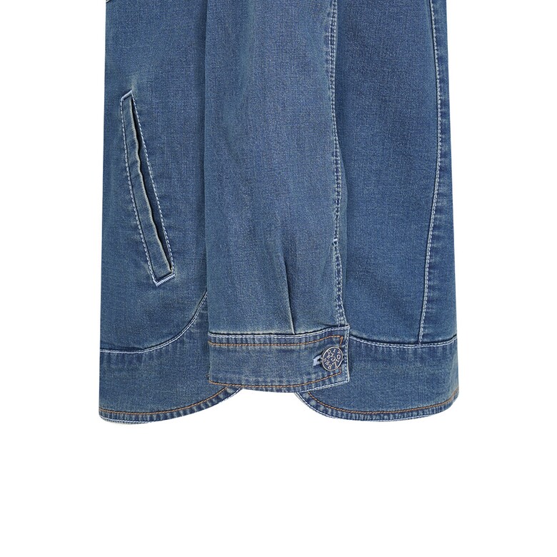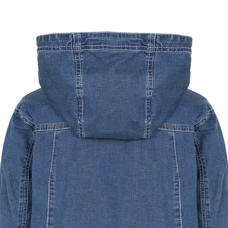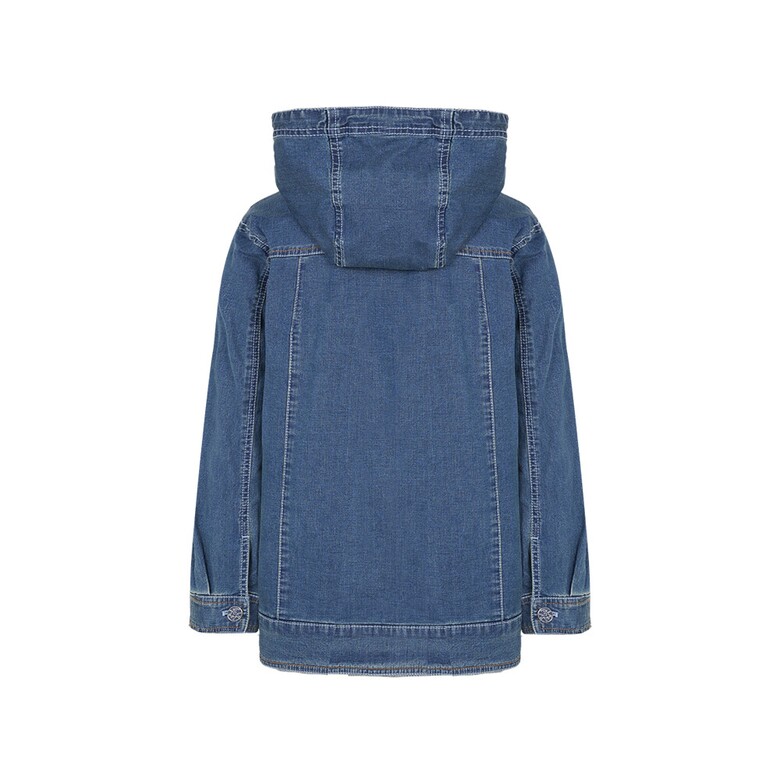 데님 자켓입니다. 후드와 캐쥬얼한 핏으로 편안하게 연출하기 좋은 데일리 아이템입니다. 상동 포켓의 메탈 자수 포인트를 주었습니다.