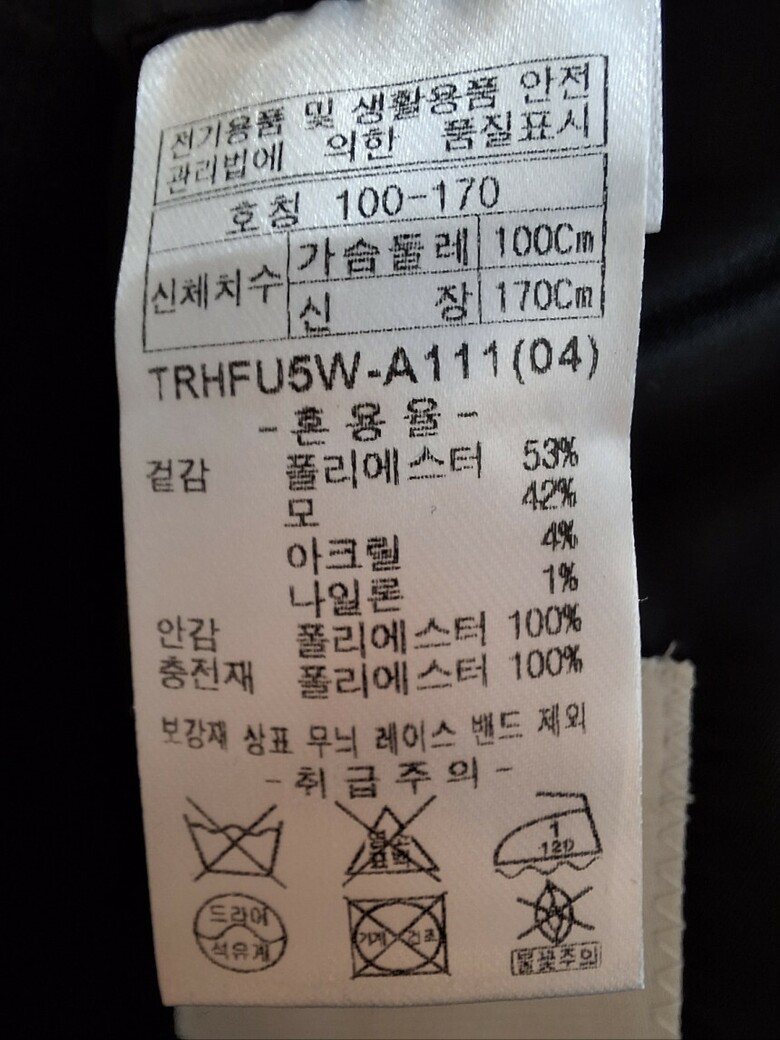 | 1. 제품 소재 (섬유의 조성 또는 혼용률을 백분율로 표시, 기능성인 경우 성적서 또는 허가서) | 겉감:폴리에스테르 53%, 모 42%, 아크릴 4%, 나일론 1% / 안감:폴리 |