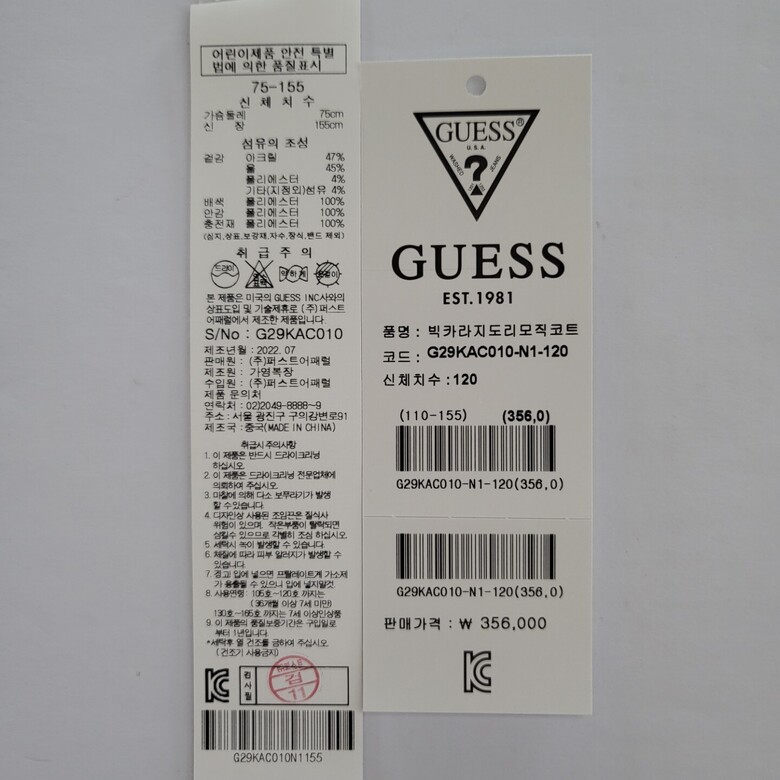 * 혼용율: 겉감 : 아크릴 47% 울 45% 폴리에스터 4% 기타섬유(지정외) 4% 배색 : 폴리에스터 100% 안감 : 폴리에스터 100% 충전재 : 폴리에스터 100%