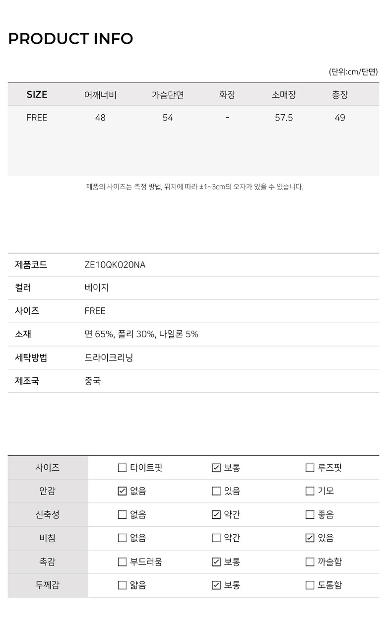 • 처음 배송된 상품상태와 다를 경우(세탁/착용 후 외출하신 경우) 반품이 불가합니다.