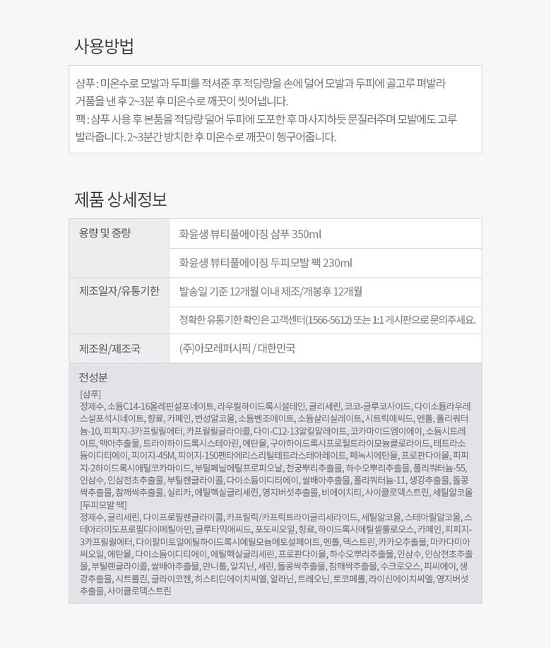 1. 용량 및 중량 샴푸 350ml + 팩 230ml