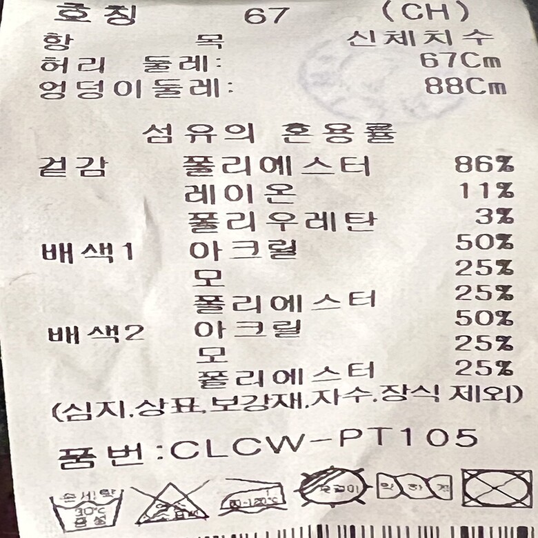 67(27) : 허리 73 힙 92 허벅지 55.2 앞길이 24.5 총기장 91