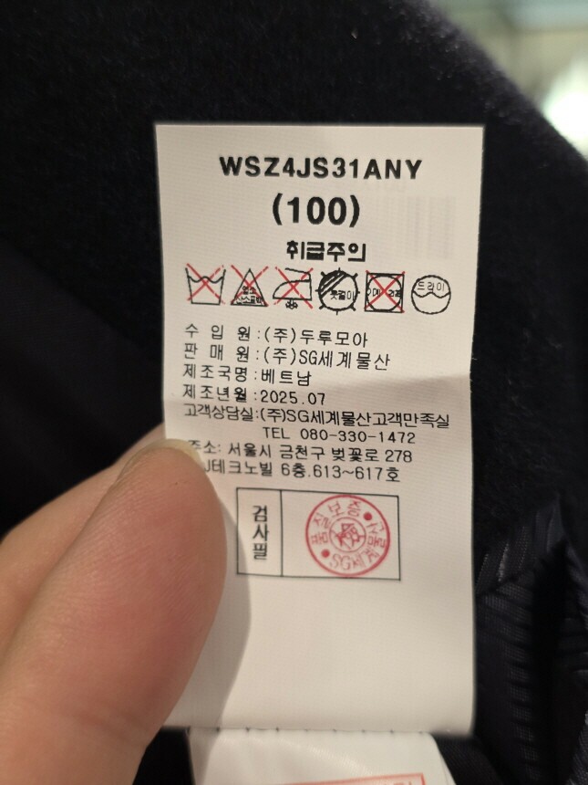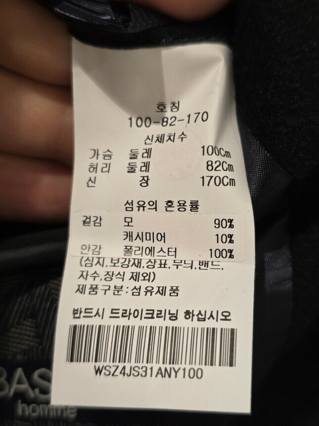 1. 제품 소재 (섬유의 조성 또는 혼용률을 백분율로 표시, 기능성인 경우 성적서 또는 허가서) 겉감 : 모 90% , 캐시미어 10% 안감 : 폴리에스터 100% (심지,보강재