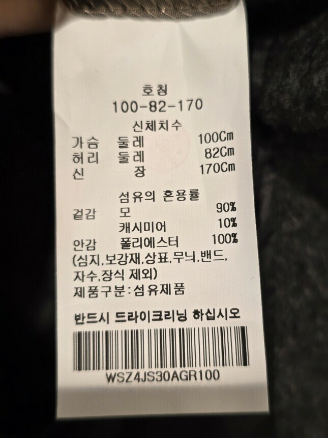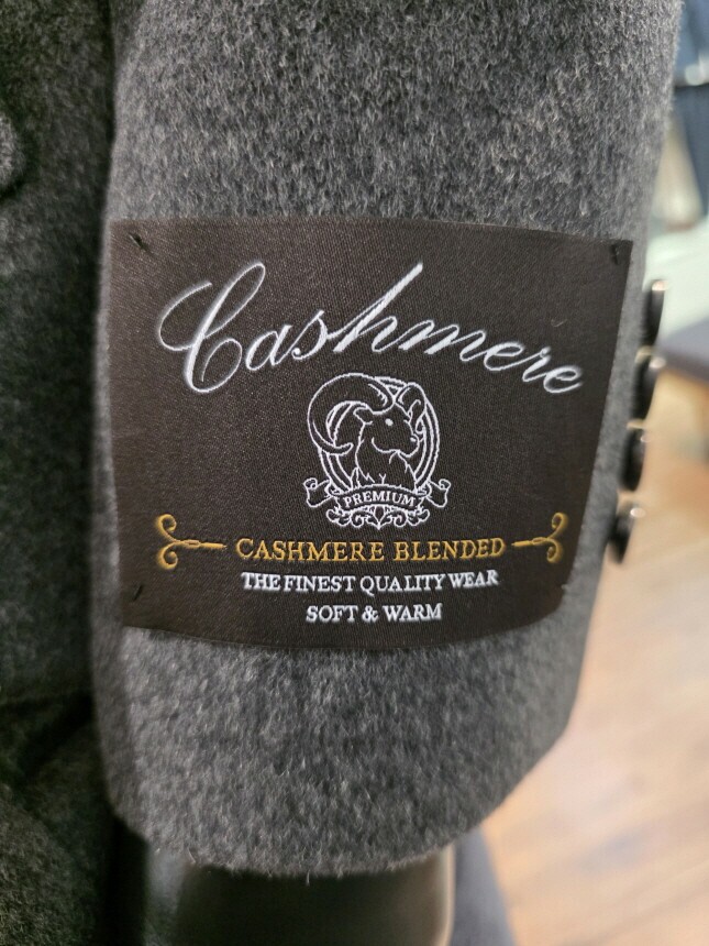 | 1. 제품 소재 (섬유의 조성 또는 혼용률을 백분율로 표시, 기능성인 경우 성적서 또는 허가서) | 겉감 : 모 90% , 캐시미어 10% 안감 : 폴리에스터 100% (심지,보강재 |