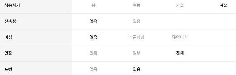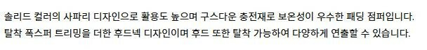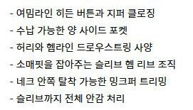 | 1. 제품 소재 (섬유의 조성 또는 혼용률을 백분율로 표시, 기능성인 경우 성적서 또는 허가서) | 상품상세참조 |