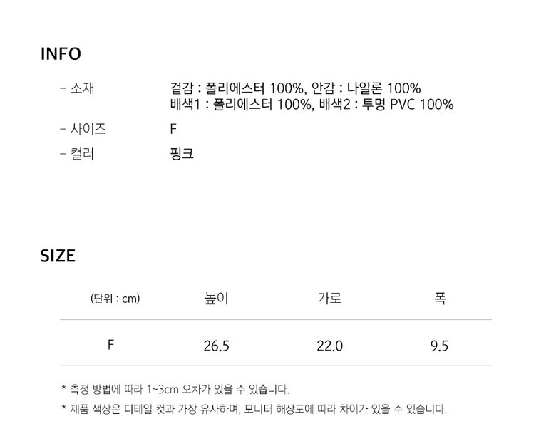 재질 : 겉감-폴리에스터100% 안감-나일론100% 배색1-폴리에스터100% 배색2-투명PVC100%