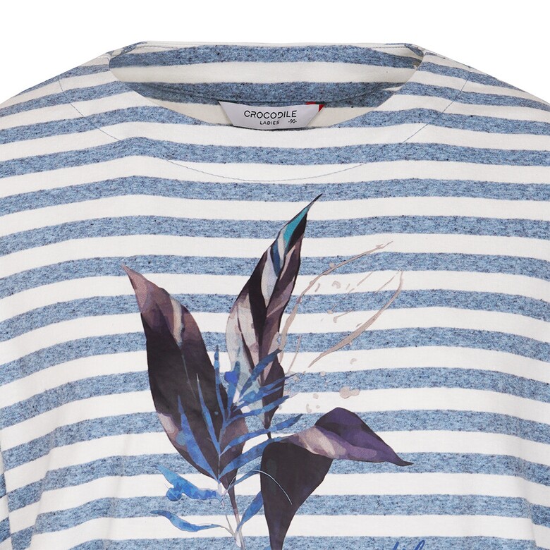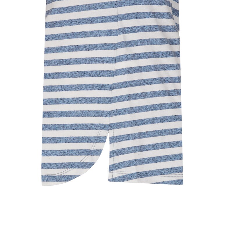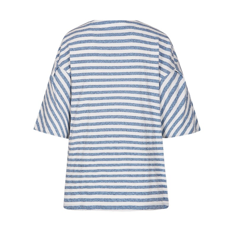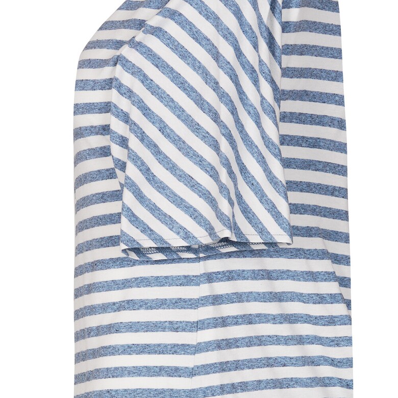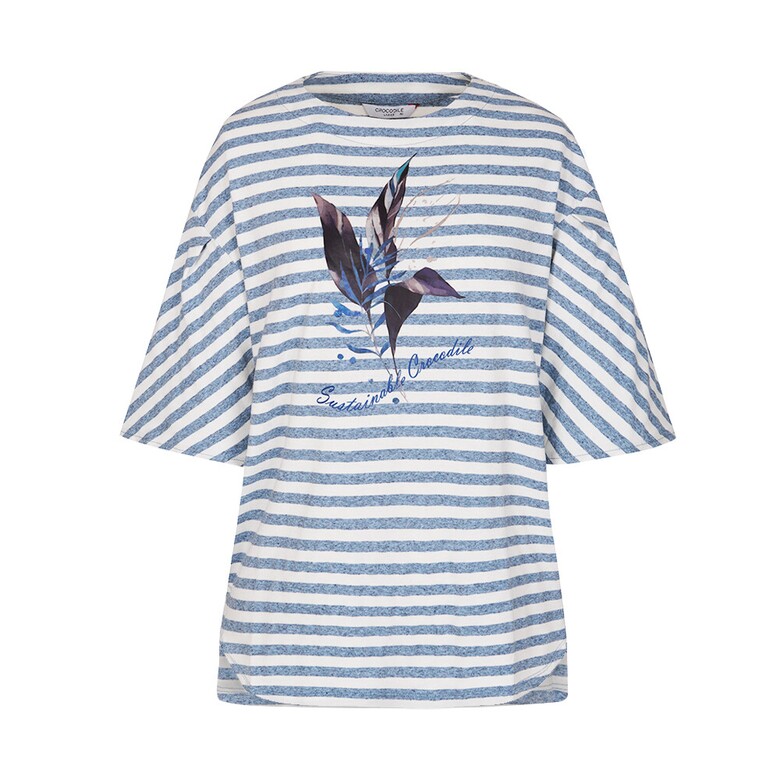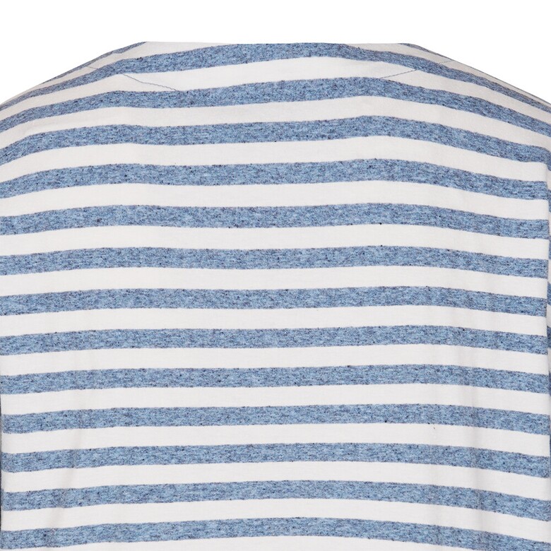 자연을 생각한 리싸이클 소재를 사용하였고 전판 선염스트라이프에 앞판 톤온톤 프린트가 포인트인 편안한 실루엣의 보트넥 티셔츠