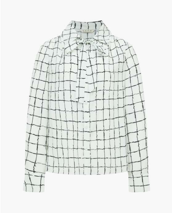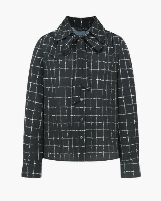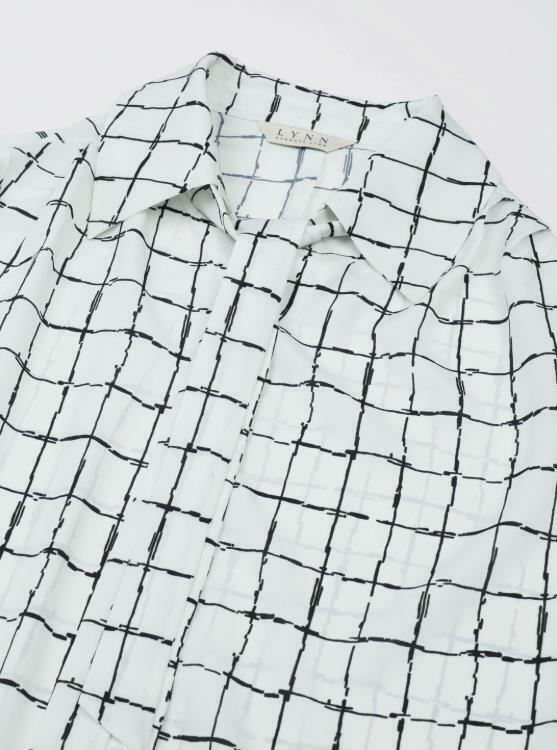 타이 넥 디테일이 돋보이는 체크 패턴 블라우스입니다.