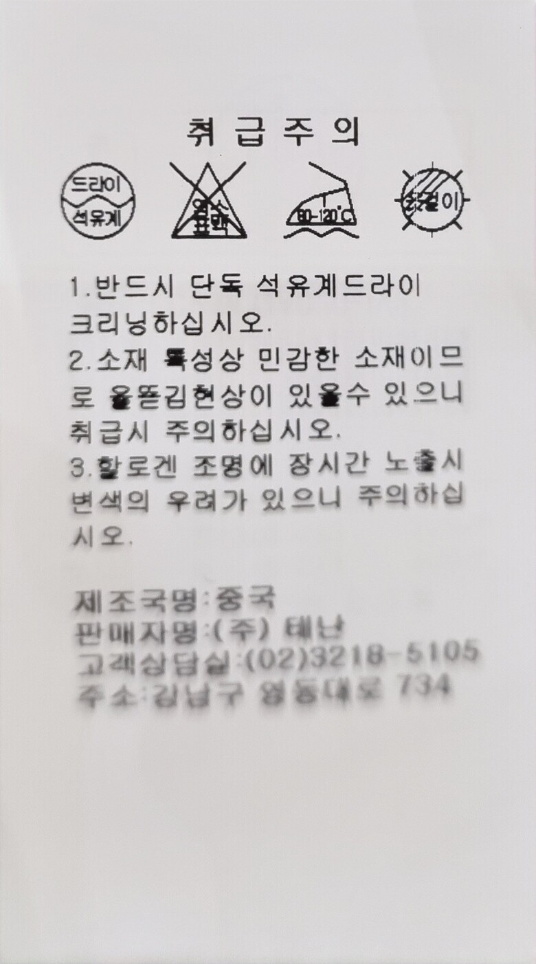 6. 세탁방법 및 취급시 주의사항 1.반드시 단독 석유계 드라이크리닝하십시오. 2.소재특성상 민감한 소재이므로 올뜯김현상이 있을수 있으니 취급시 주의하십시오. 3.습윤시 마찰에 의한 이염현상에 주의하십시오.