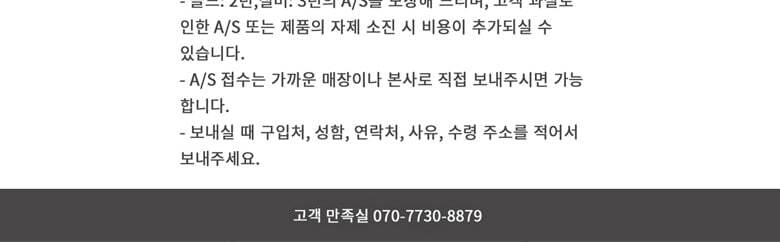상품불량에 의한 반품, A/S, 품질보증 및 피해보상 등에 관한 사항은 소비자 분쟁해결기준(공정거래위원회 고시) 구매자가 미성년자인 경우에는 상품 구입시 법정대리인이 동의하지 아니하면 미성년자 본인 또는 법정대리인이 구매취소 할 수 있습니다. |