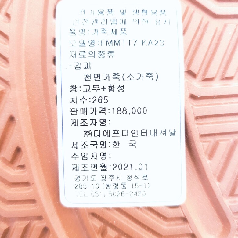 | 1. 제품 소재 (운동화인 경우에는 겉감, 안감을 구분하여 표시) | 소가죽 |