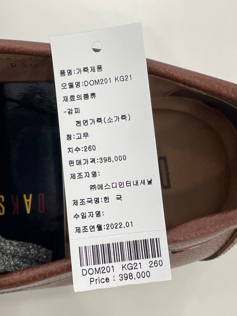 | 1. 제품 소재 (운동화인 경우에는 겉감, 안감을 구분하여 표시) | 소가죽 |