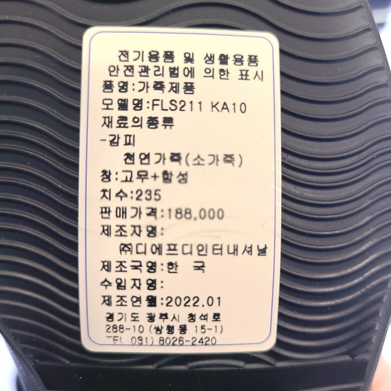| 1. 제품 소재 (운동화인 경우에는 겉감, 안감을 구분하여 표시) | 소가죽 |