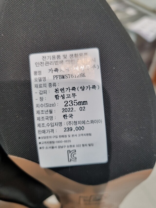 | 1. 제품 소재 (운동화인 경우에는 겉감, 안감을 구분하여 표시) | 양가죽 |