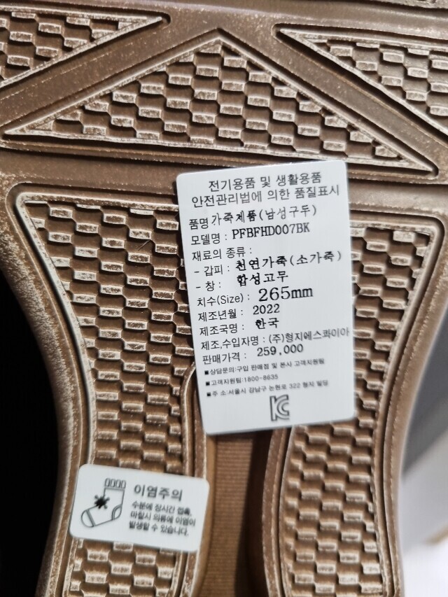 | 1. 제품 소재 (운동화인 경우에는 겉감, 안감을 구분하여 표시) | 소가죽 |