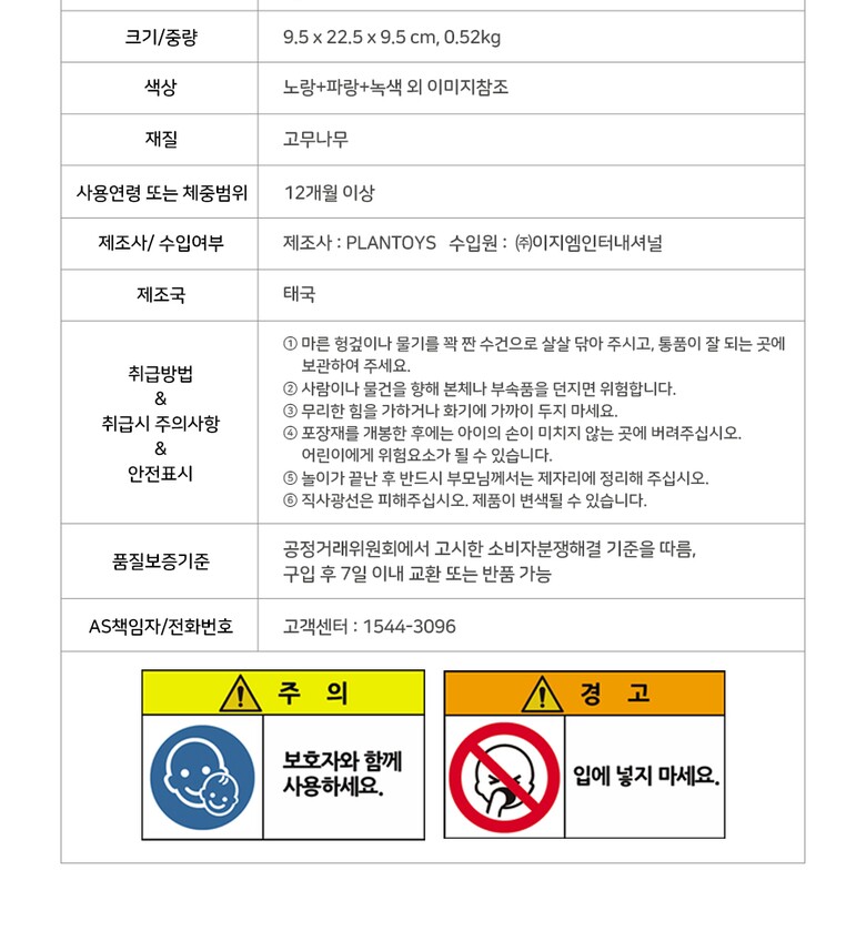 10. 취급방법 및 취급시 주의사항, 안전표시 (주의, 경고 등) | 마른 헝겊이나 물기를 꽉 짠 수건으로 살살 닦아 주시고 통풍이 잘되는 곳에 보관하여 주세요.절대로 올라 타거나 밟지 마십시오.사람이나 물건을 향해 본체나 부속품을 던지면 위험합니다.무리한 힘을 가하거나 화기에 가까이 두지 마세요. 포장재를 개봉한 후에는 아이의 손이 미치지 않는 곳에 버려주십시오. 어린이에게 위험요소가 될 수 있습니다.놀이가 끝난 후 반드시 부모님께서는 제자리에 정리해 주십시오.직사광선은 피해주십시오. 제품이 변색될 수 있습니다. |