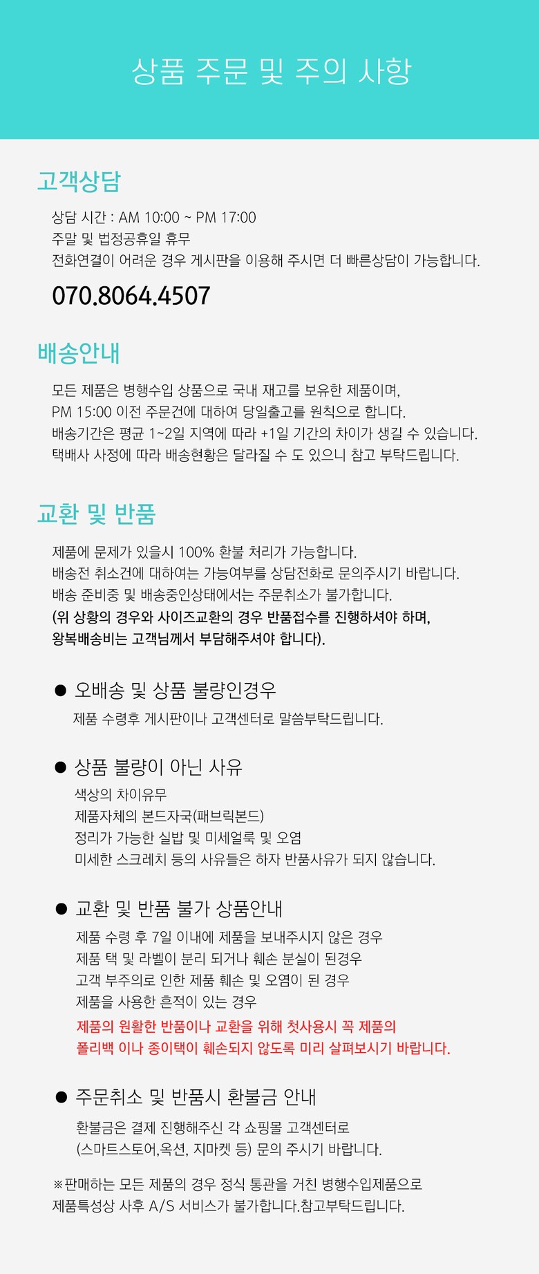 상품불량에 의한 반품, A/S, 품질보증 및 피해보상 등에 관한 사항은 소비자 분쟁해결기준(공정거래위원회 고시) 구매자가 미성년자인 경우에는 상품 구입시 법정대리인이 동의하지 아니하면 미성년자 본인 또는 법정대리인이 구매취소 할 수 있습니다. |