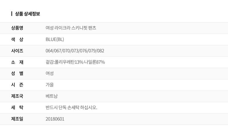 | 1. 제품 소재 (섬유의 조성 또는 혼용률을 백분율로 표시, 기능성인 경우 성적서 또는 허가서) | 겉감:폴리우레탄13% 나일론87% |