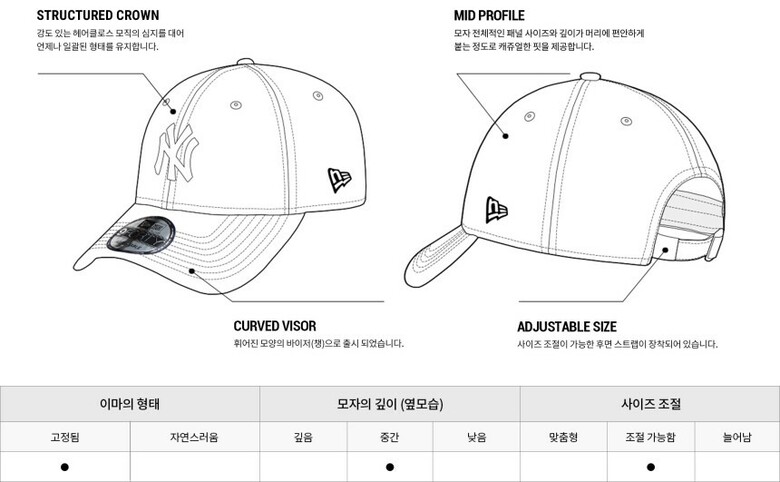 안정적인 깊이감과 형태, 자연스러운 커브드 바이저로 부담 없이 착용 가능합니다. 제품의 안쪽 자체 개발된 Sweat 밴드는 탁월한 땀 흡수력과 착용감을 제공합니다.