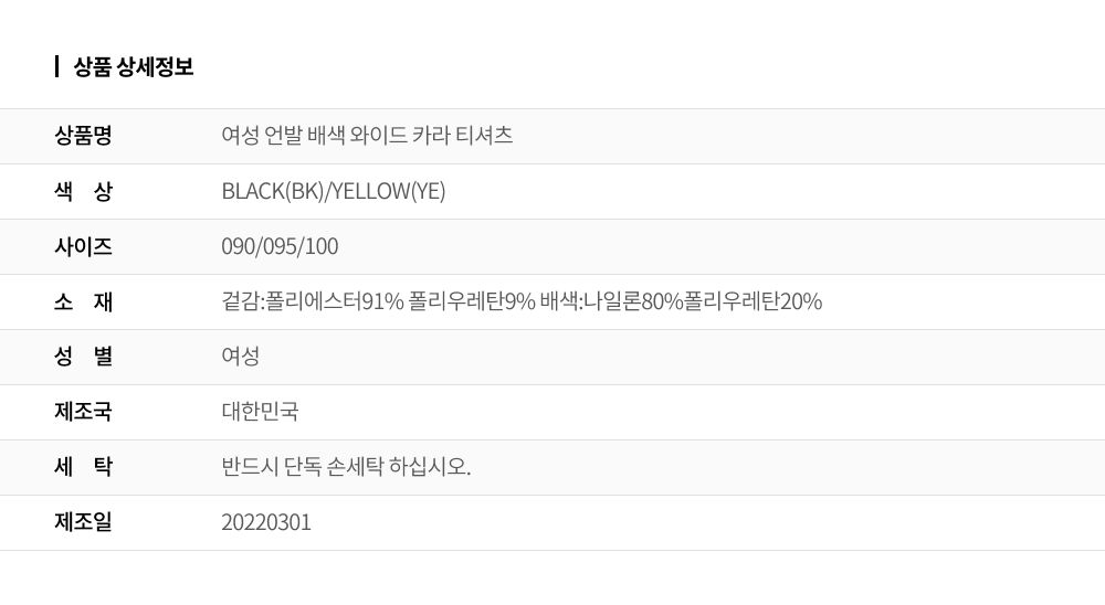 | 1. 제품 소재 (섬유의 조성 또는 혼용률을 백분율로 표시, 기능성인 경우 성적서 또는 허가서) | 겉감:폴리에스터91% 폴리우레탄9% 배색:나일론80%폴리우레탄20% |