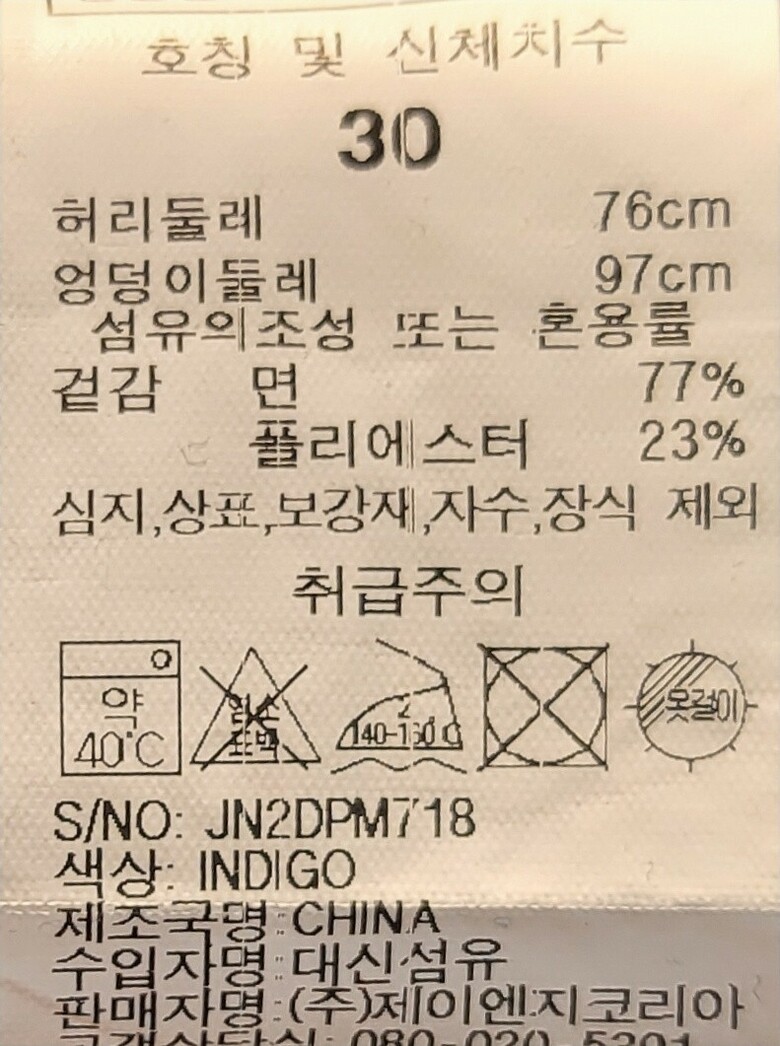| 1. 제품 소재 (섬유의 조성 또는 혼용률을 백분율로 표시, 기능성인 경우 성적서 또는 허가서) | 겉감:면 98%, 폴리우레탄 2% |