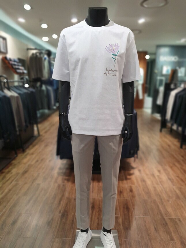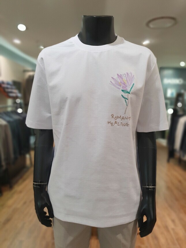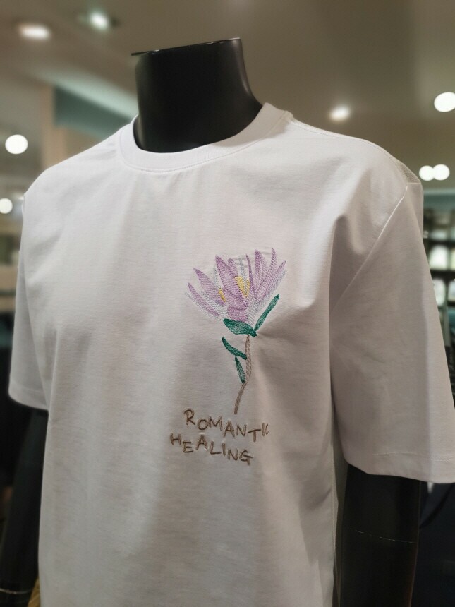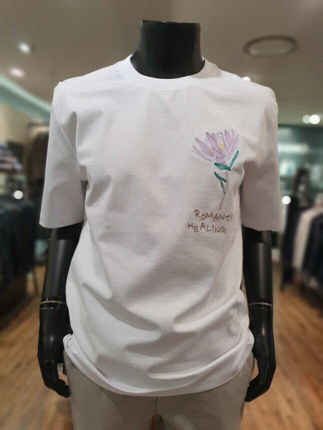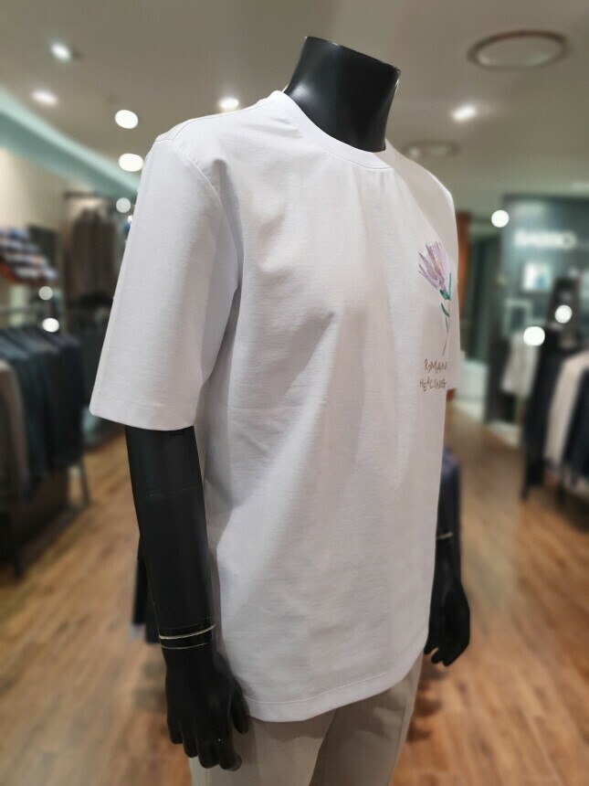 [바쏘옴므] 23년 화이트 플라워자수 세미오버핏 반소매 티셔츠