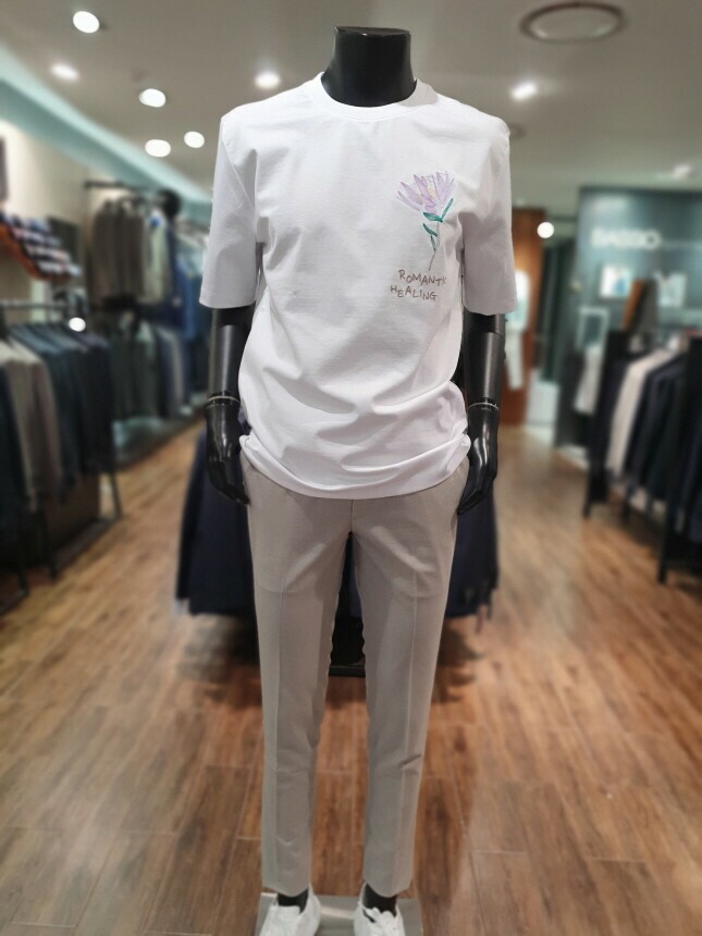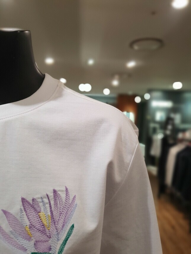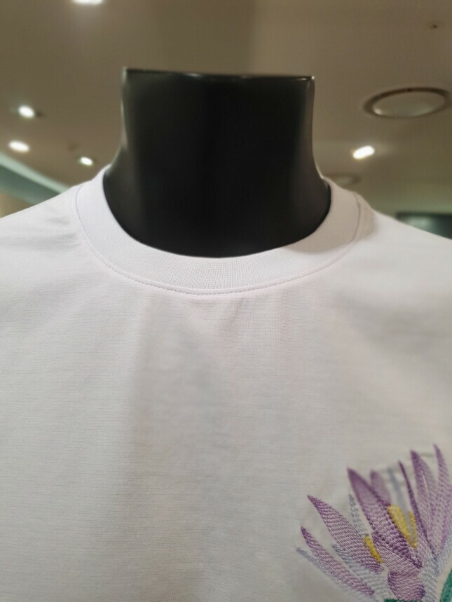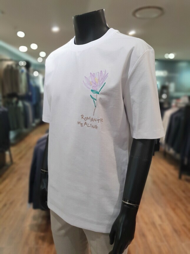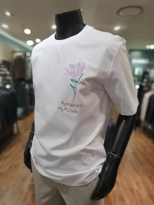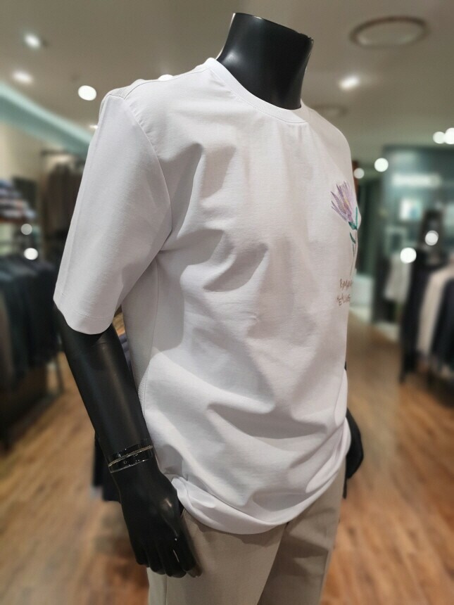 [바쏘옴므] 23년 화이트 플라워자수 세미오버핏 반소매 티셔츠