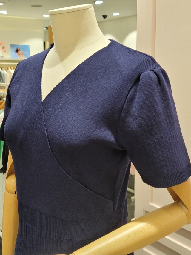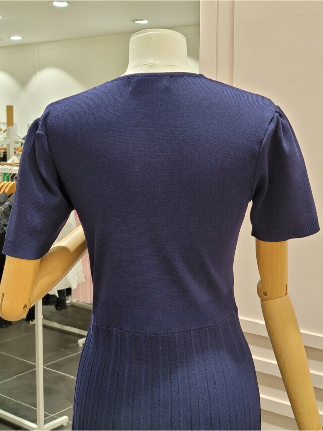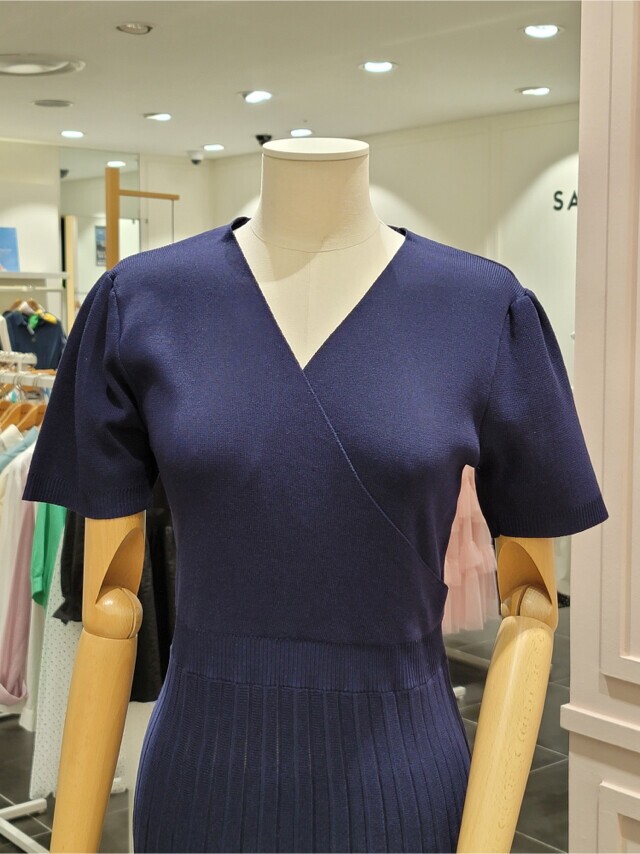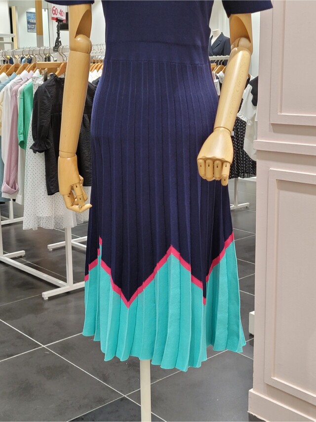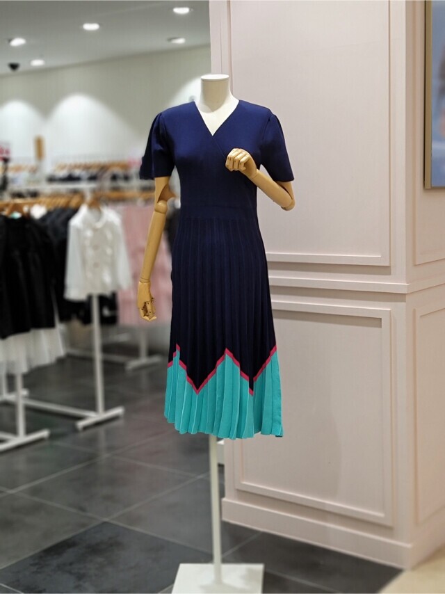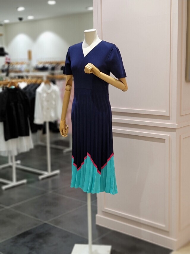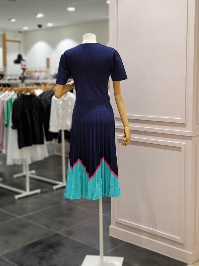 샤틴 브이넥 밑단 배색 플리츠 원피스 S232k901