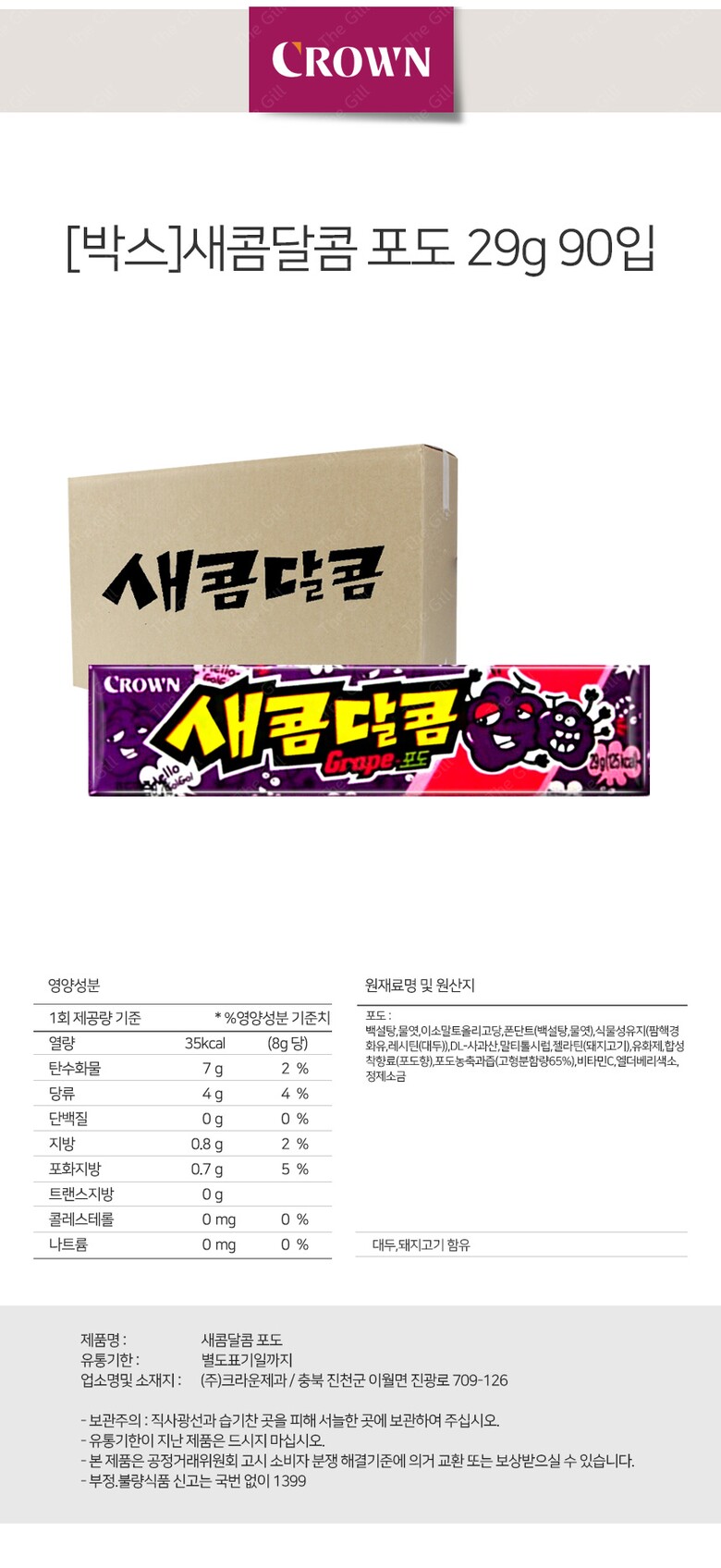 해당 상품은 [ [박스] 크라운 새콤달콤 포도 29g 90입 ] 구성의 상품입니다.