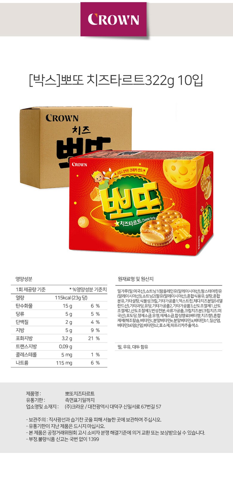 해당 상품은 [ [박스] 크라운 뽀또 치즈타르트 322g 10입 ] 구성의 상품입니다.