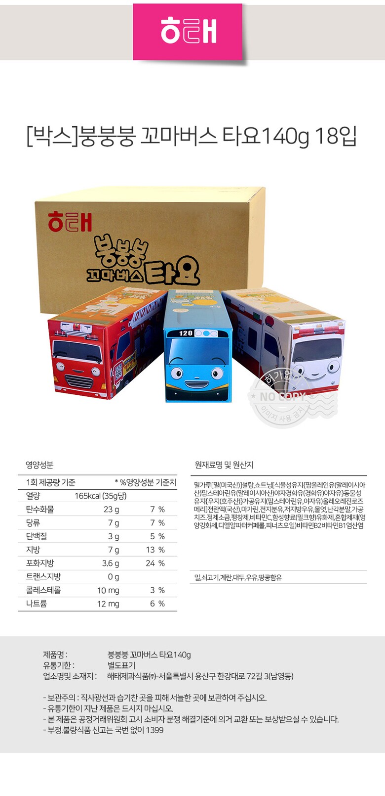 해태 [박스] 붕붕붕 꼬마버스 타요 140g 18입