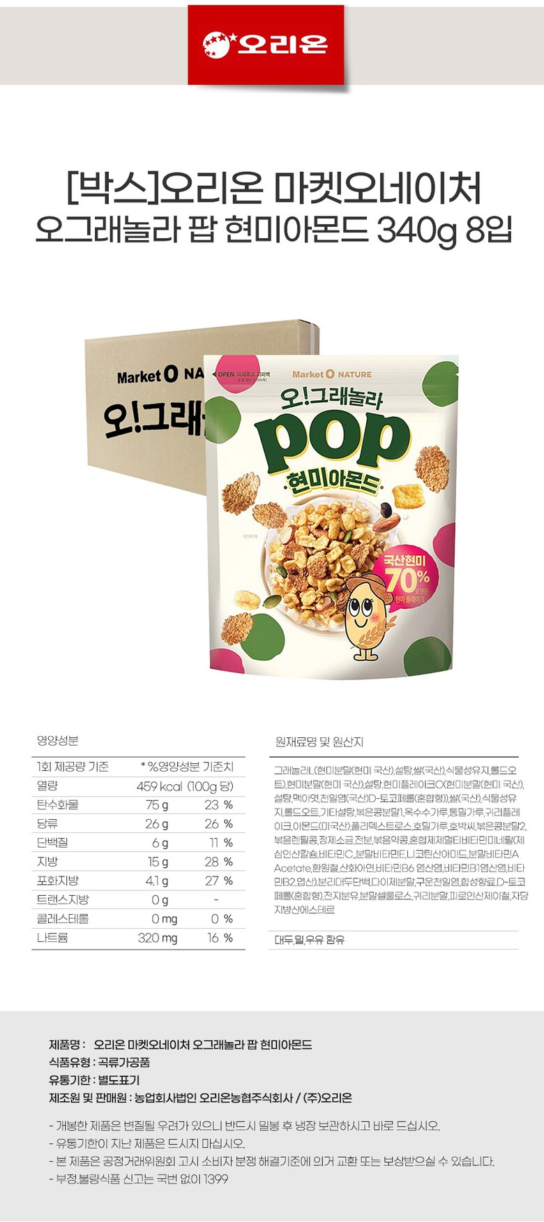 | 1. 포장단위별 용량(중량),수량,크기 | [박스]오리온 마켓오네이처 오그래놀라 팝 현미아몬드 340g 8입 (2720g) |