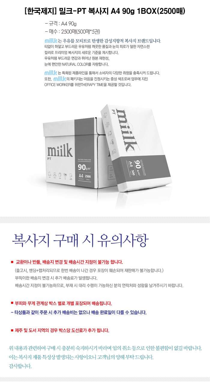 [한국제지] 밀크-PT 복사지 A4 90g 1BOX(2500매)