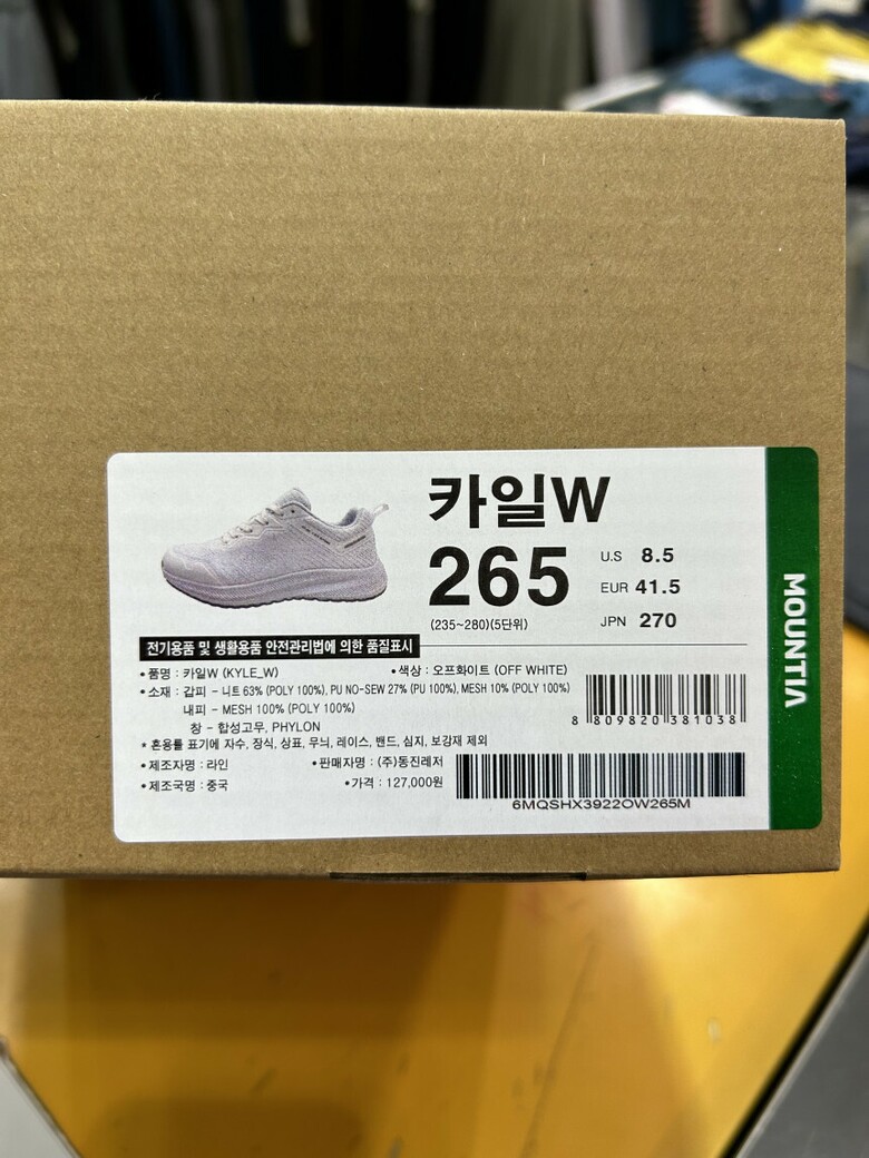 | 1. 제품 소재 (섬유의 조성 또는 혼용률을 백분율로 표시, 기능성인 경우 성적서 또는 허가서) | 갑피 : 니트63%(폴리에스터100%),PU NO-SEW27%(PU100%),MESH10%(POLY |