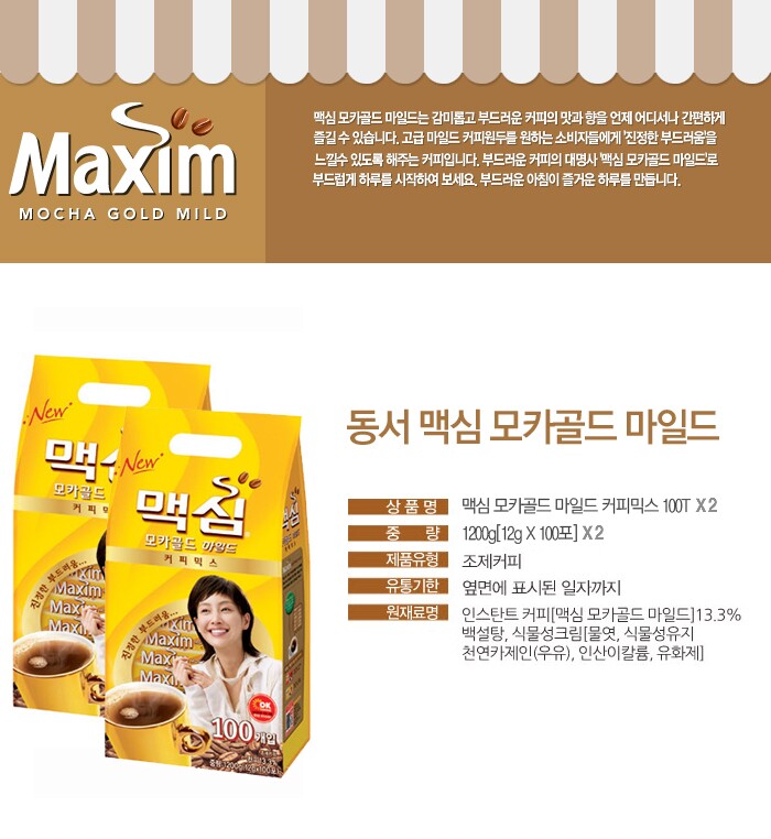 | 1. 포장단위별 용량(중량),수량,크기 | 맥심 커피믹스 모카골드 100T 2팩389011 |