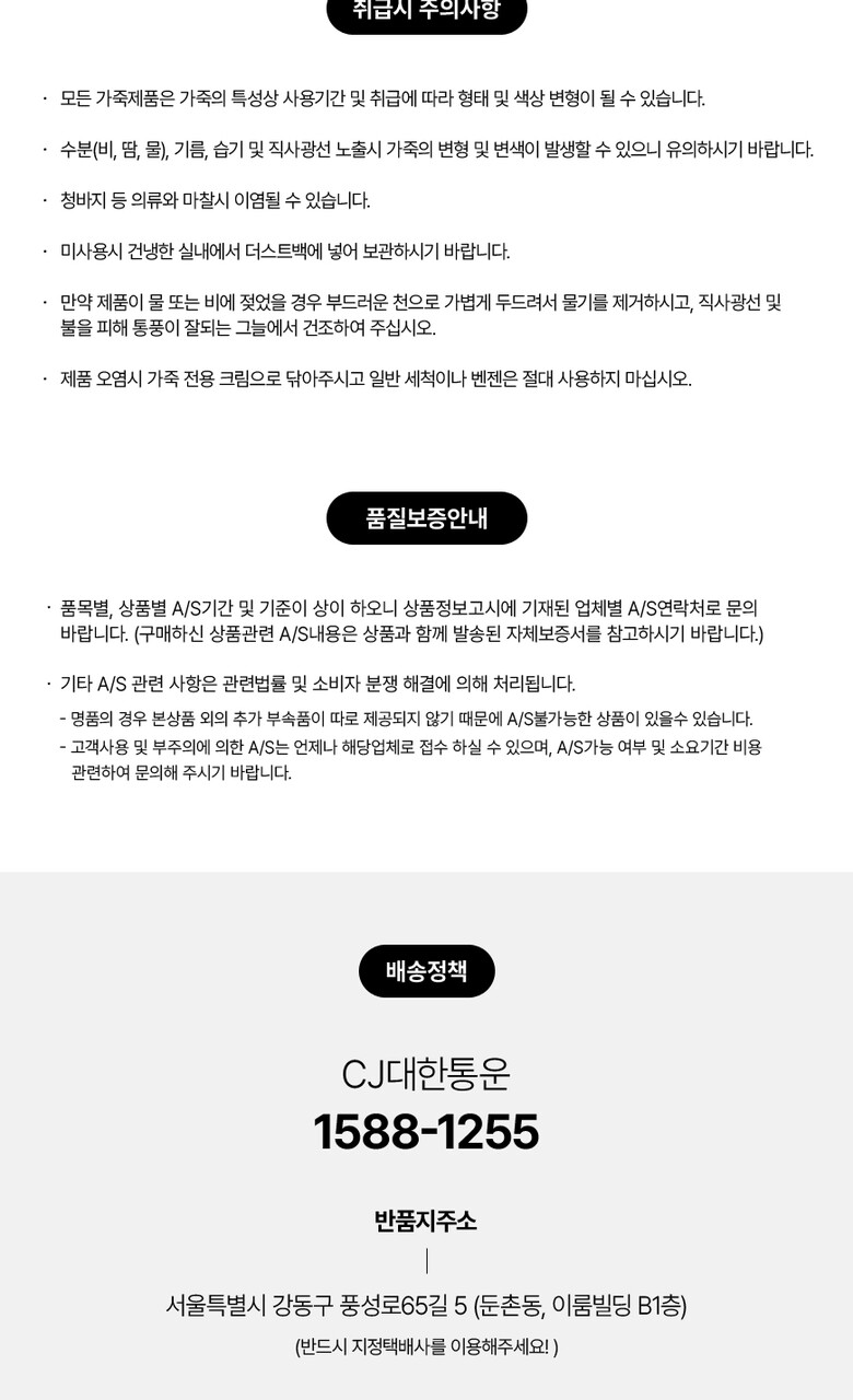 • 처음 배송된 상품상태와 다를 경우(세탁/착용 후 외출하신 경우) 반품이 불가합니다.