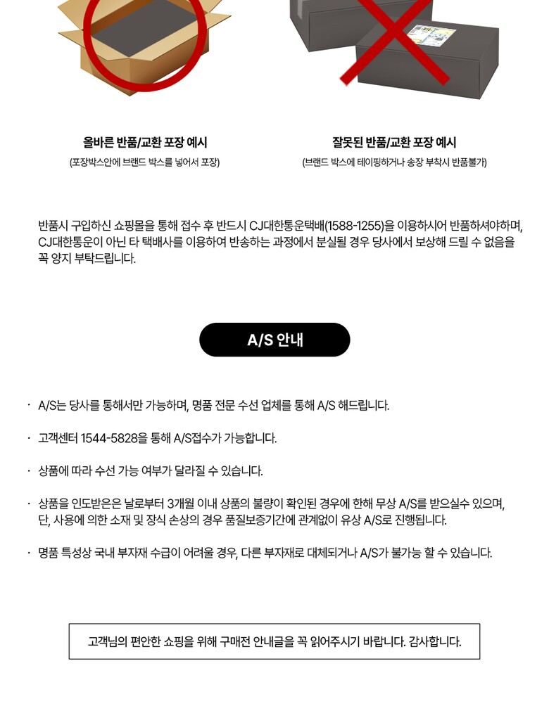 • 브랜드 박스로 포장된 상품은 해당 박스에 직접 테이핑, 송장을 부착한 경우 반품이 불가합니다.