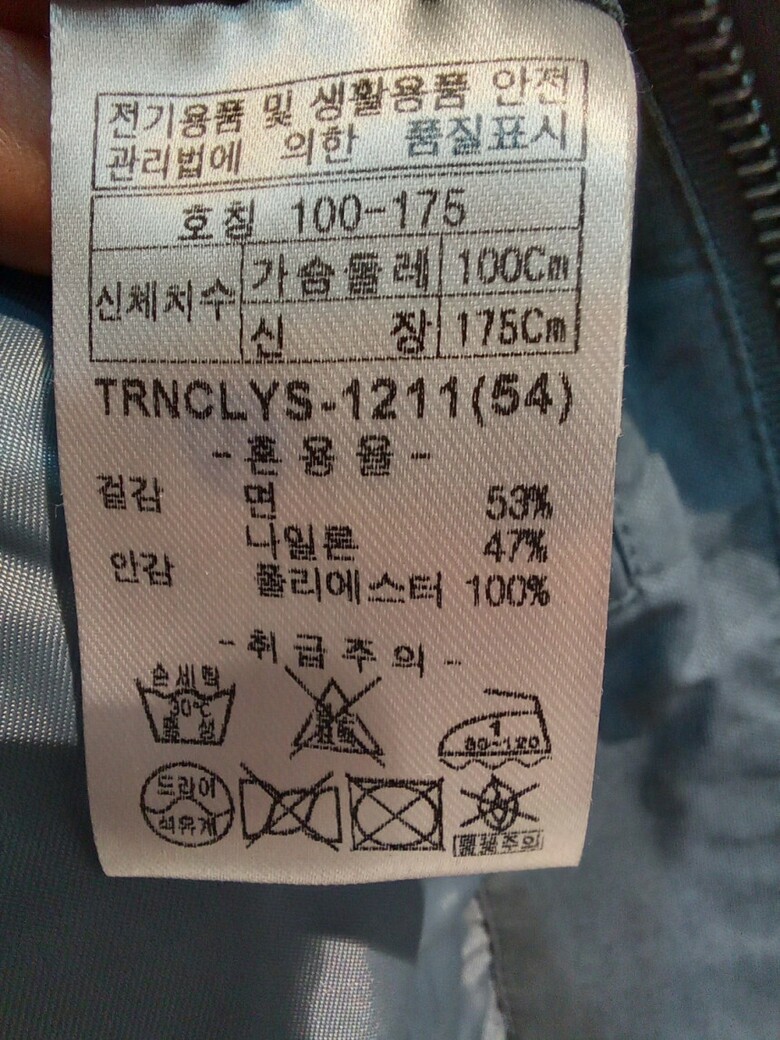 | 1. 제품 소재 (섬유의 조성 또는 혼용률을 백분율로 표시, 기능성인 경우 성적서 또는 허가서) | 면 53%, 나일론 47% / 겉감:면 53%, 나일론 47% / 안감:폴리에스테르 |